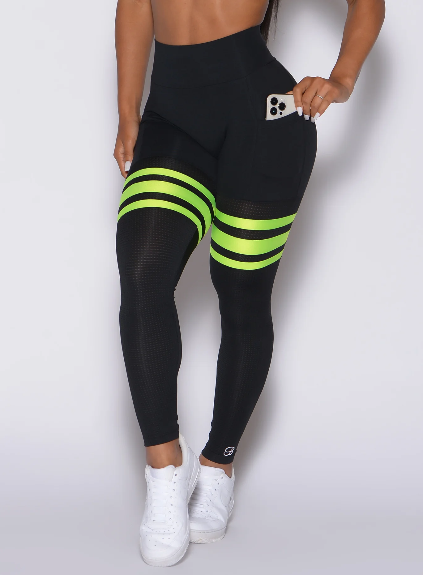 Bombshell’s Design Patented Scrunch Butt Thigh-Highs with pockets and no front seam! Sleek and sexy, these Neon Thigh Highs are made for workouts and beyond. Constructed with our buttery soft Second Skin fabric with super 4 way stretch in every direction. A body hugging flattering fit combined with mesh to keep you cool during your workouts.